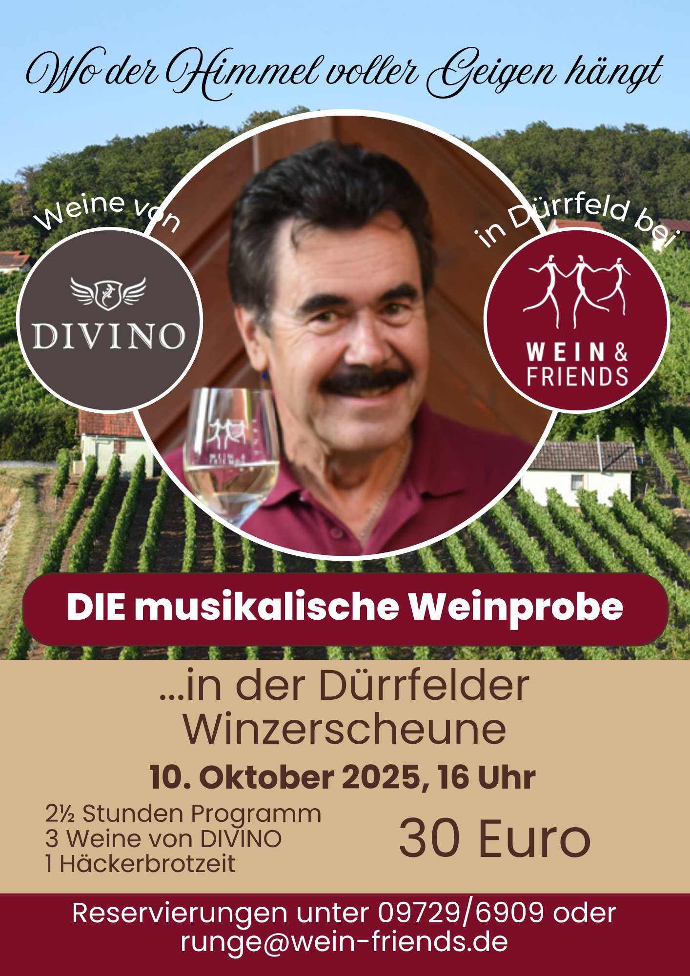 Hören, …schmecken, …genießen Sie stimmungsvolle Musik und herrliche Frankenweine mit allen Sinnen: Gerhard Runge, der „singende Winzer“ nimmt Sie mit auf eine musikalische Reise durch die faszinierende fränkische Weinwelt von SILVANER & CO. Mit seinen modernen Weinliedern aus eigener Feder, seinen spritzigen, manchmal auch tiefgründigen Texten und beschwingten Melodien vermag er es immer wieder seine Gäste aufs Neue zu bezaubern.